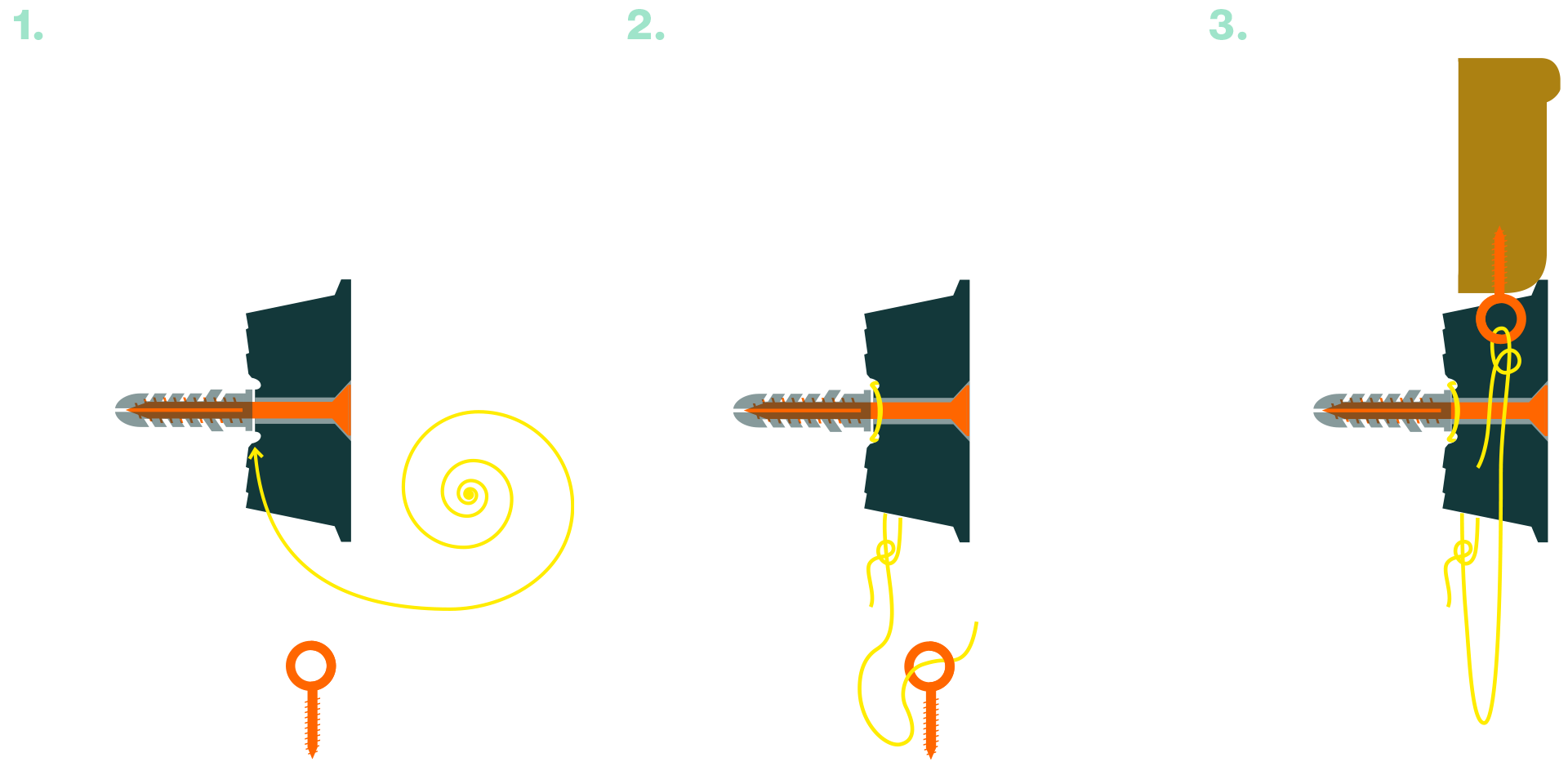 Wir empfehlen ein Stahlseil mit einem Durchmesser von 1,3 mm oder eine dünne, aber ausreichend starke Schnur um das Bild zu befestigen.