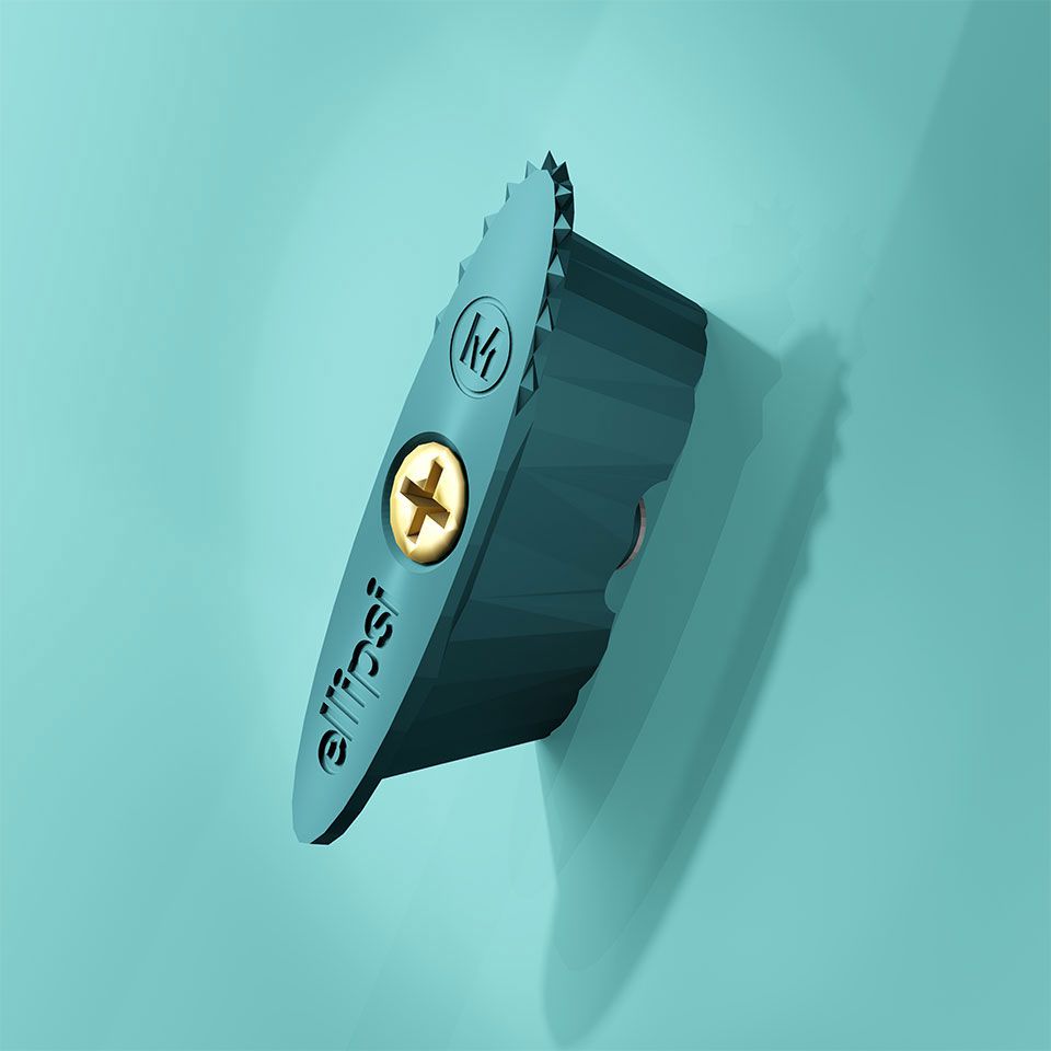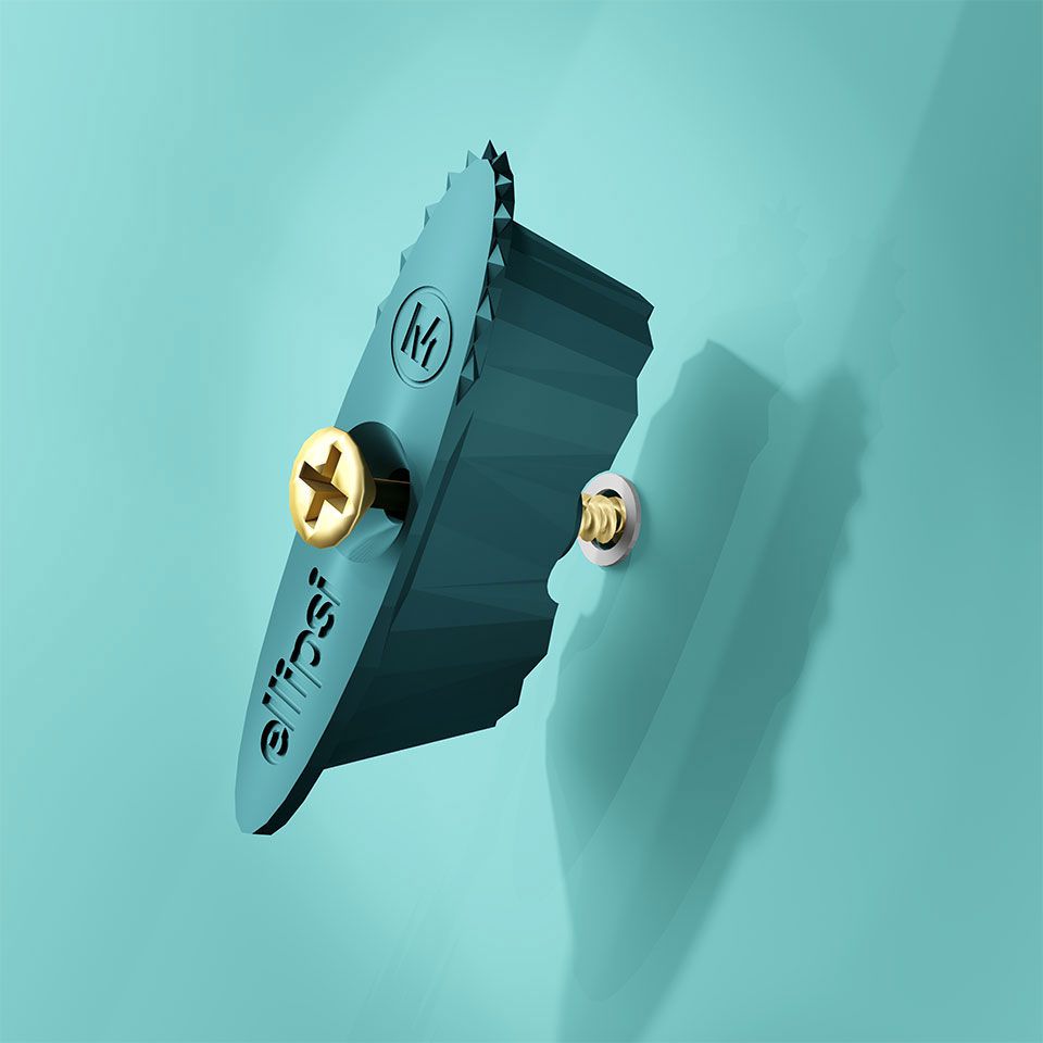 Außerdem verfügt ellipsi® auch an der Unterseite über eine leichte Aussparung, sowie über sich zur Mitte hin verjüngende Grate. Auf diese Weise kann ellipsi® perfekt auf Dübeln mit Kragen fixiert werden, während die Grate auf die Wand hinausgreifen. Diese Kombination sorgt schließlich für maximalen Anpressdruck und absolut sicheren Halt in der gewünschten Stellung.